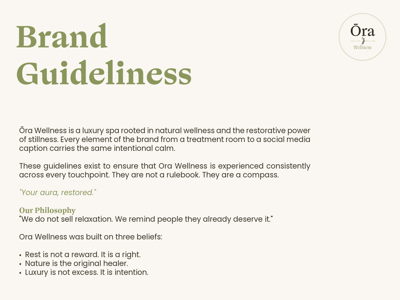 From there, I developed the brand name Ōra Wellness - the macron over the Ō referencing aura, breath, and breeze, signaling the careful attention to detail the brand would carry throughout.
